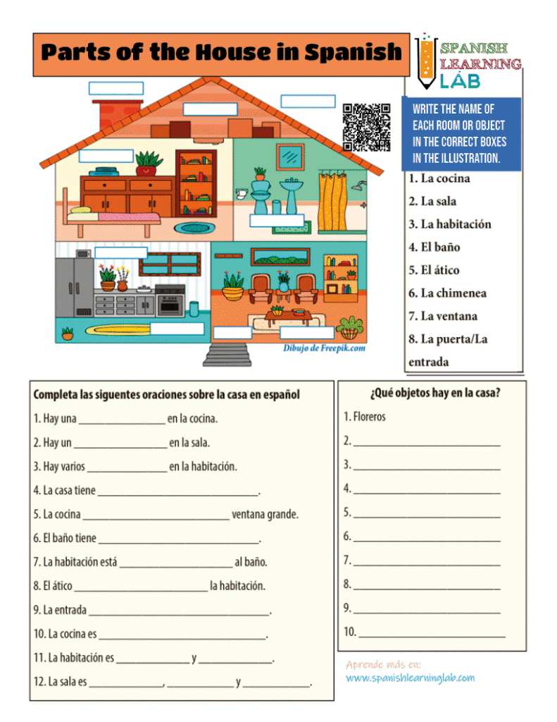 Hello! In this worksheet, you will find exercises on the vocabulary for rooms and parts of the house in Spanish, as well as the structure of the sentences with verbs like “HAY” (there is/are), “TENER” (to have), “SER” (to be) and other verbs, in addition to the prepositions of place in Spanish.