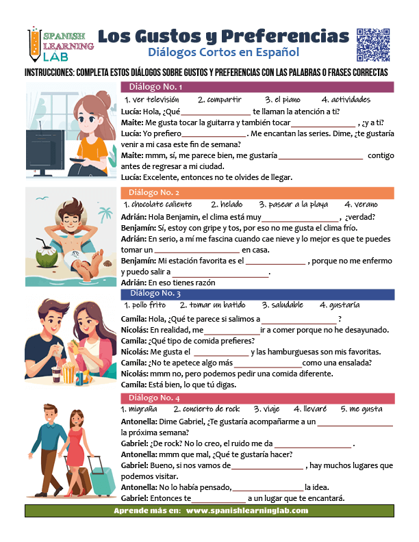 ¡Hola! Gracias por acompañarnos. Hemos diseñado esta genial hoja de ejercicios en PDF para que hables un poco sobre gustos y preferencias en español, resolviendo un ejercicio con diálogos cortos en PDF. ¡Comencemos!