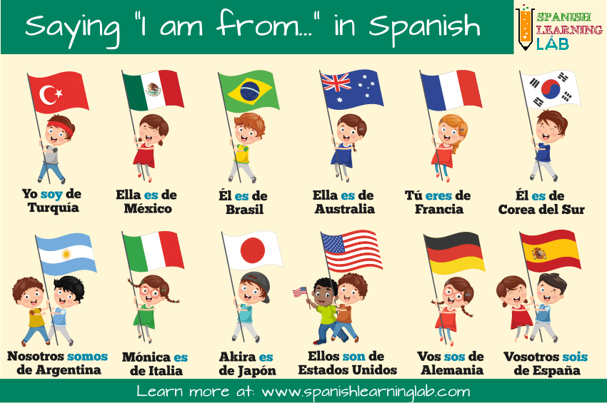 The following image shows how we can use the verb “ser” in its different forms to talk about our own country or the country of origin of other people in Spanish: