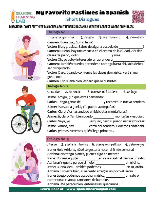 ¡Hola! Welcome to our site! This time, we are sharing a PDF worksheet to practice key vocabulary and expressions about hobbies in Spanish with three different dialogues. Let’s get started…