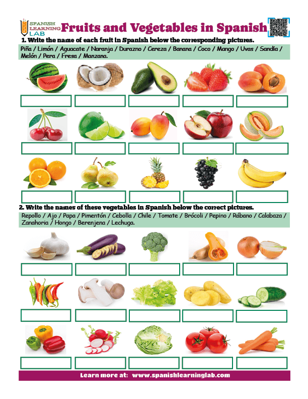 This material consists of two simple exercises. To solve the first one, students should read the list of words at the top of the worksheet, look up any unfamiliar words in their dictionaries, and then write the name of the fruits in Spanish under the corresponding photos. For the second exercise, students should read the list of vegetables and, as in the first exercise, and then write the name of the vegetable under the corresponding image.